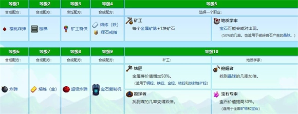 4、采矿技能是通过使用工具镐敲碎岩石来提高的,每级会增加1点十字镐的熟练度。通过破坏岩石你将获得采矿的技能点,不管你是通过使用十字镐或炸弹还是活动的怪物。