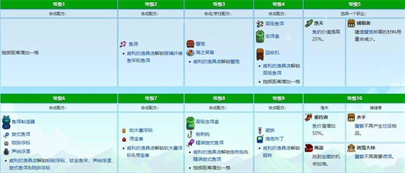 6、钓鱼技能是通过使用钓鱼竿/杆抓鱼或垃圾或者收获蟹笼来提高的。每级增加1点钓鱼竿的熟练度,增加钓到最小的鱼的大小(英寸/厘米)和钓鱼条的高度,并减少鱼咬钩之前的等待时间,钓鱼技能还能提高发现的鱼的品质。