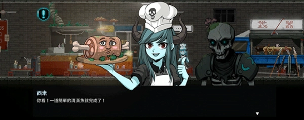 《餐瘾地城》(英文名Dungeon Munchies)是一款无厘头风格的横版动作闯关游戏。游戏的背景设定在一个光怪陆离的地下世界里,玩家将化身为死灵厨师西米创造出的僵尸,在西米的帮助下开启地下城冒险之旅。旅途中需要击败各类敌人,以此收集菜谱与食材,通过食用特定食物来增强自身属性。
