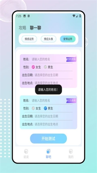 4、在聊吧页面,可轻松实现情感和爱情测试,还能在线查找和情侣头像。