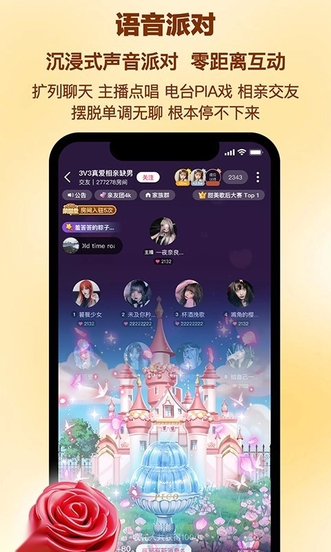 实时在线连麦互动,情感、音乐、脱口秀等多元领域汇聚众多颜值与才艺兼备的语音主播。无论是聊天交友、唱歌娱乐、pia戏互动、游戏开黑,还是倾诉心事,都能借助语音在闲暇时光结识更多有趣伙伴。更设有温馨甜蜜的相亲房间,助你邂逅最契合的那个TA。