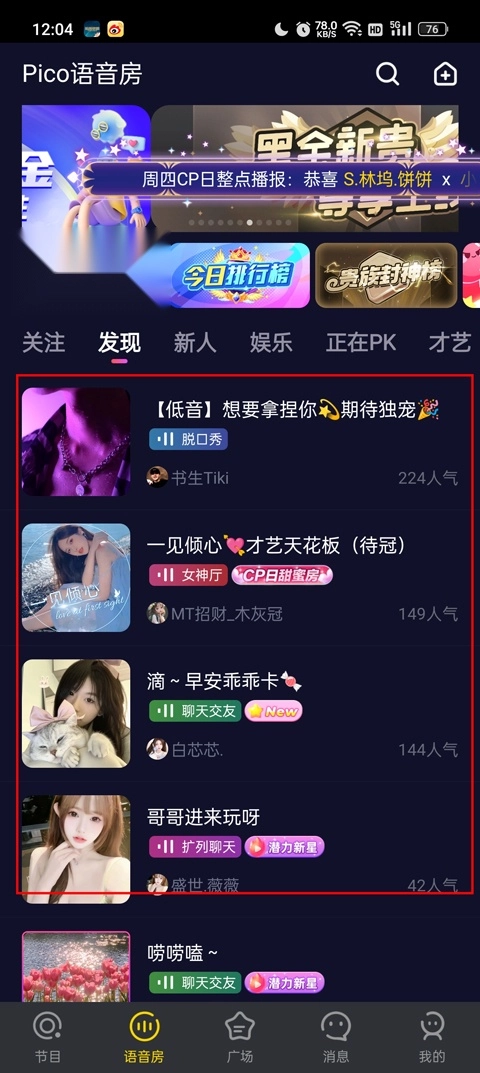 5、接下来是语音房环节,你可以选择进入自己感兴趣的语音房,在这里,只要找到志同道合的人,同样能够进行匹配聊天。