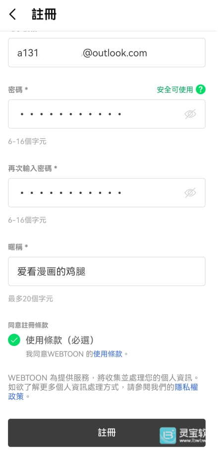 3、输入邮箱、密码和昵称,勾选使用条款,点击最下方的【注册】。
