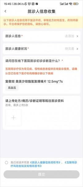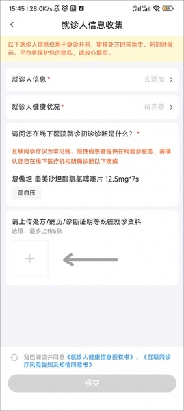 6、最后请将处方/病历/诊断证明等既往就诊资料上传,最后点击提交即可购买处方药