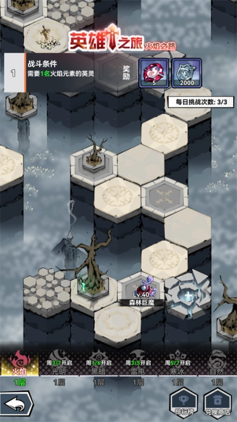 英雄之旅有6个地图,分别对应着6种元素,领主需要上阵对应的元素英灵进行挑战。通关成功后将掉落对应的元素形成,但每天开放的元素地图不同。