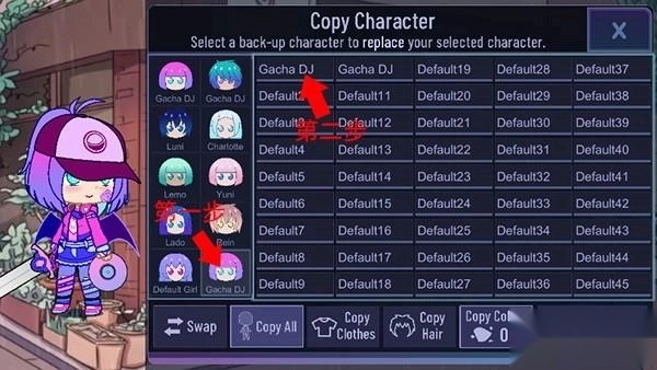 2、接着来到人物备份界面后,左侧为我们当前已创建角色,右侧为角色备份区域,如果我们要复制某个角色的话,首先在左侧选中想要复制的角色后,再点击右侧备份区域中的某个Default选项,来将我们的角色备份至备份中