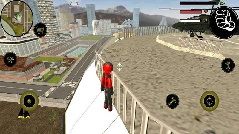 左侧移动、加速,右侧绳索,攻击(跳跃),跳跃,右上侧的武器更换以及血量、经验的显示都实时更新,一览无遗,凭借着大家自由的玩法,与其他帮派的人物进行交火,期间杀人能够获得经验,杀多了会产生星级,警察和其他附近角色会特殊照顾你对你展开火热的进攻,而如何存活,如何将其他人物击杀则是你所需要完成的任务。