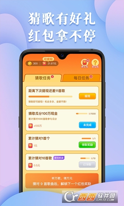 最强猜歌王红包版是一款趣味满满的红包赚钱游戏,玩法特别简单,玩家只需依据一小段歌曲旋律猜出对应的歌名就能顺利通关。游戏曲库相当丰富,完成关卡挑战就能拿到红包奖励,感兴趣的朋友可以到西西最强猜歌王红包版体验一番。