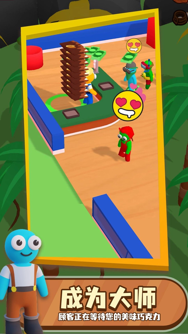 经营你的巧克力工坊,成长为巧克力大师!顾客正期待着你制作的美味巧克力呢!摇晃树木让可可豆荚掉落,收集可可后投入机器,就能生产出更多巧克力。把巧克力棒摆上货架,然后卖给顾客。通过解锁草莓、香蕉和牛奶等新材料来开发新口味,还能雇佣工人、购置新的巧克力工厂。把巧克力卖出去赚取更多财富,就能解锁更多食材,采购更先进的机器。