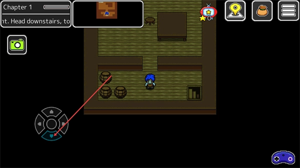2、进入游戏场景后,通过左下角的移动控件操控角色移动,按照提示Headdownstairs前往楼下区域,推进当前章节的剧情。