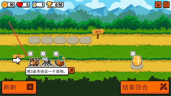 2、每回合获得金币后,在商店区域花费对应金币购买小动物随从,购买后随从会自动进入阵容空位。