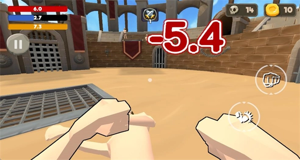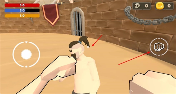 1、进入角斗场景后,通过操作按钮控制角色移动,与对手展开近战对决,消耗对手属性值以推进战局。