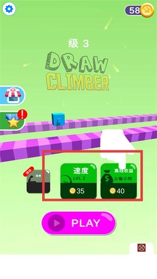 1、在【级-3】的【DRAW-CLIMBER】界面,先确认【速度-LVL-2-35】和【离线收益-40-每小时】这两项内容,然后点击【PLAY】按钮进入关卡。