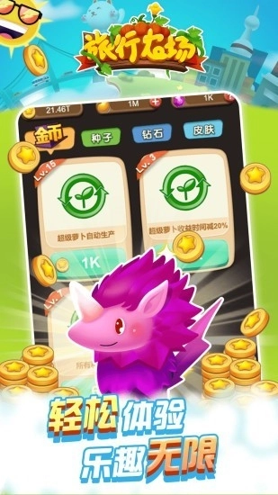 旅行农场是一款模拟经营类的农场游戏!游戏里有搞怪的农作物和魔性猎奇的画风,能瞬间抓住你的眼球,全新的自动化生产模式让你想玩就玩,不受时间地点限制!玩家需要不断扩大自己的农场规模,让农场发展得越来越大,这样就能赚取更多金币,成为农场富豪。