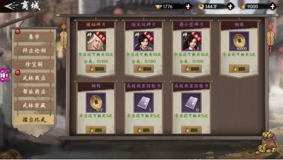 挑战获取的声望,可以在擂台比武商城兑换奖励。值得注意的是每种道具每日限定购买次数,大侠一定要合理分配手中的声望值,避免浪费。这里推荐优先兑换侠客碎片,毕竟好的侠客在挑战中会起到更关键的作用。