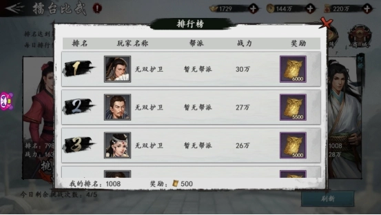 在擂台比武中,大侠可以选择心仪的比武对象并发起挑战。位于最右侧的是大侠自己的当前排名和战力。挑战对手前可以先行查看对方的战力和排名,这样才能知己知彼百战百胜。每日共有5次挑战次数,如果你对场上的四位对手不满意,还可以选择刷新,随机更换其他对手供大侠挑选。
