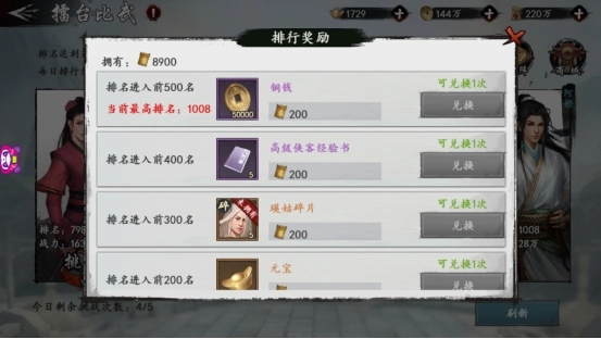 当大侠的排名进入前500名内时,会随着名次提升逐步解锁限定奖励。这些奖励使用声望进行兑换,且每项仅可兑换1次。奖励包括史诗侠客瑛姑碎片、稀有侠客韩小莹碎片、元宝、侠客经验书等奖励。大侠可以选择优先兑换侠客碎片和元宝奖励,这些对战力的提升帮助更大。