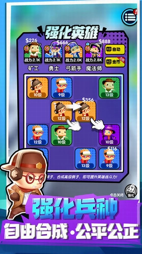 2、放置战斗的方式以及合并升级的形式,完美的结合在一起,让游戏变得更加的有趣,操作难度不大;