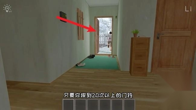 这是最简单的一种结局,我们只需把门铃按到20次之后,妈妈就会发疯,然后打开前面的小门,我们跟在后面悄悄的离开就行了,千万要等妈妈离远一点在出门,不然会被妈妈回头抓住的。