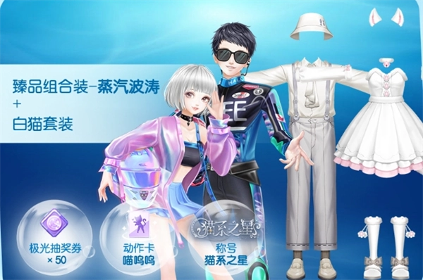参与萌猫寻宝集结活动即可获得动作卡-喵呜鸣、称号-猫系之星,活动期间掉落的猫猫冰棍可在清凉小铺兑换动作卡-喵呜鸣、白猫套装、6月25日可兑换臻品组合装-蒸汽波涛、极光抽奖券50