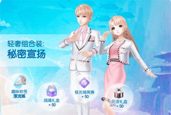 参与海底秘宝初探活动即可获得轻奢组合装秘密宣言、琉璃礼盒*50、极光抽奖券*50、花语礼盒*50