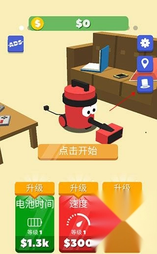 1、在本站下载并安装好《吸尘器大作战》中文版后,可使用金币对吸尘器的电视时间、移动速度和离线时长进行升级,操作时点击界面右上角的帽子图标即可。