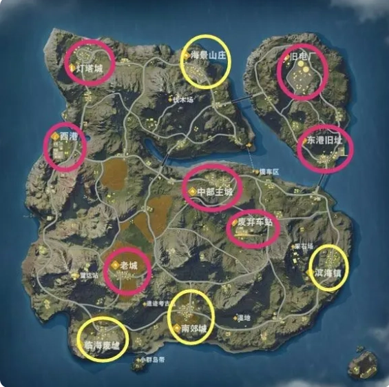 根据降飞机出发位置和飞行时间,尽早选择好自己的降落地点。不要一味的追求建筑物多的地方,建筑物越多,遇到的敌人可能性越大,吃鸡的几率就越小(当然,大神除外)。所以,本人根据某一地点降落人数的多少,总结出了下图: