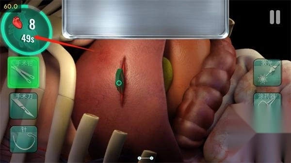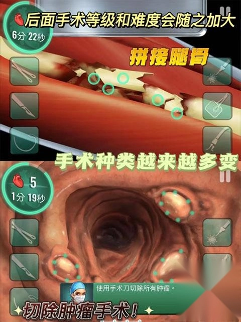 6、手术是有时间限制的,在左上角的显示的时间内完成得分会更高。如果时间到了还没完成则手术失败。