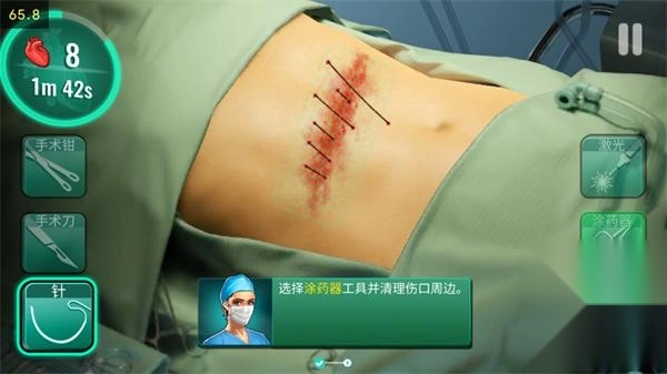 5、先点击针将病人的伤口缝合起来,再点击涂药器清理伤口周边区域,手术就完成啦。