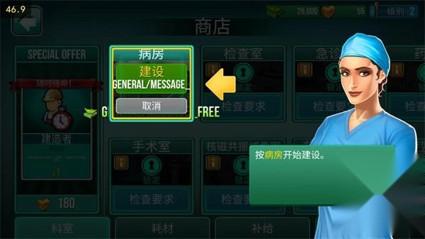 8、建好医院后,还需要建设病房让病人可以居住,进入商店可以访问病房和其他科室,点击建设即可开始建设,在病房位置点击绿色“√”即可建好。
