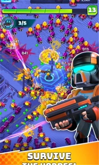 游戏的核心玩法聚焦于生存与策略的结合,你需要指挥6名各具特色的士兵组建作战小队,激活炮塔等战略单位来协同战斗。在5个风格截然不同的竞技场中,你将对抗如潮水般涌来的虫族杂兵,以及压迫感十足的巨型Boss。每局关卡的敌人配置和资源点分布都不会重复,Roguelike的随机性让每次挑战都充满未知与刺激。