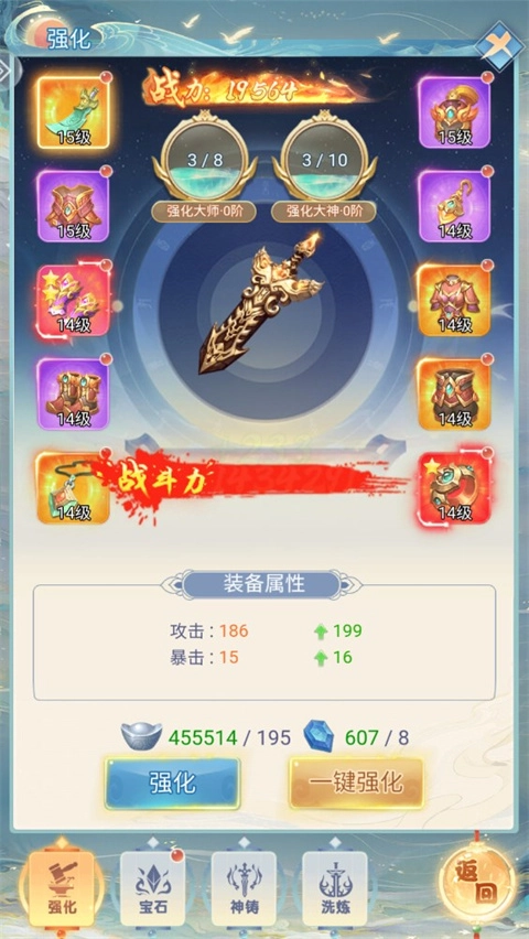 通过对武器进行强化、宝石、神铸、洗练等可让你变的更加强大。