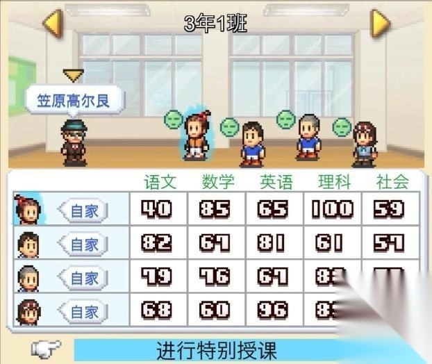 教育列表的『特殊授课』一栏可以查看需要提升成绩的学生,需要提升的学生头顶会出现绿色表情图标,平均成绩决定了教室地板颜色不同。