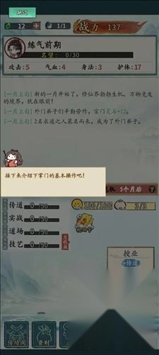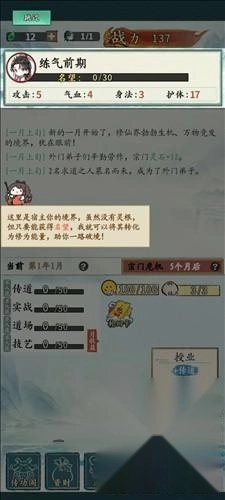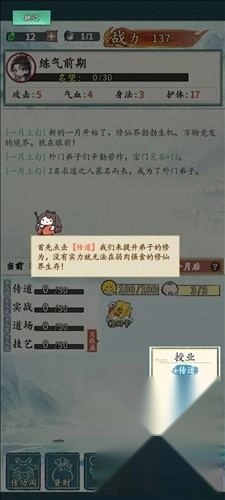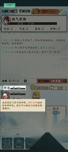 5、传道是宗门实力的评级,提升品级会有很多的好处,玩家可以按照自己的想法随意提升;旁边的精力指的是每个月可消耗的精力,由于执行不同的操作都需要消耗精力,所以要记得关注一下这里;