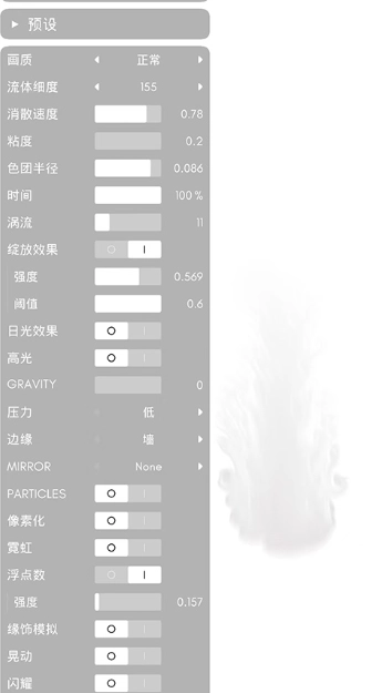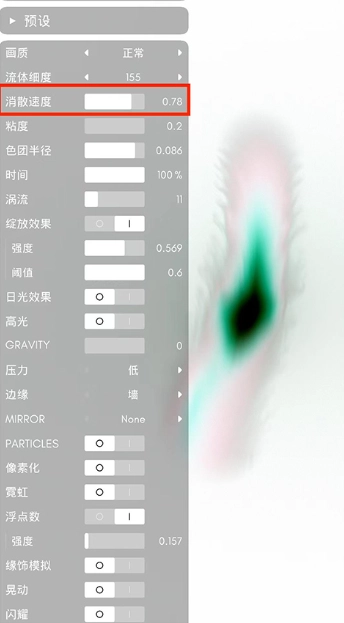 Q: 如何调整流体效果(如涡流、色彩)?