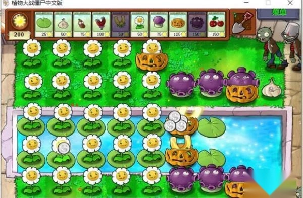 2、开局阵容,如下图。留两百个阳光,以免蒜头或者南瓜头被吃掉。