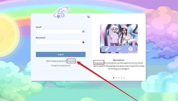 1、打开everskies后点击“点击进入”,按照图示点击【Register】按钮启动注册流程。