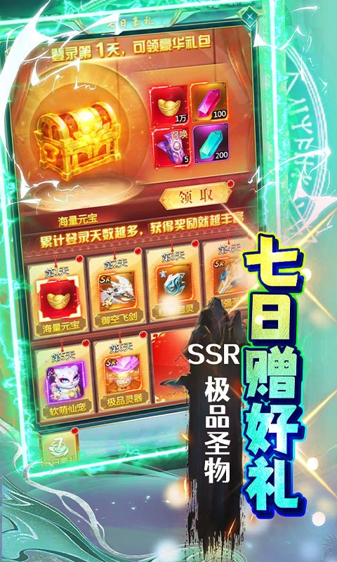 七日送福利:前七日登录可领取大量材料,第七日直领SSR极品圣物