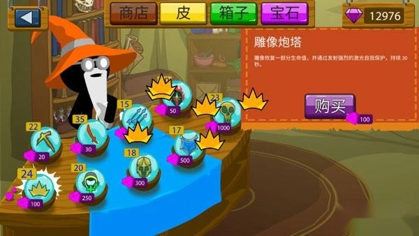 然后等敌人来了后控制矛兵,然后让矿工撤退,让城堡弓兵射,你就顶个盾吸引伤害不让敌人打雕像就行了