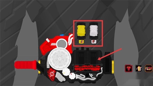 4、选中【红框内的黄-白道具】,将其装配到腰带装置,进一步完善变身组件配置。