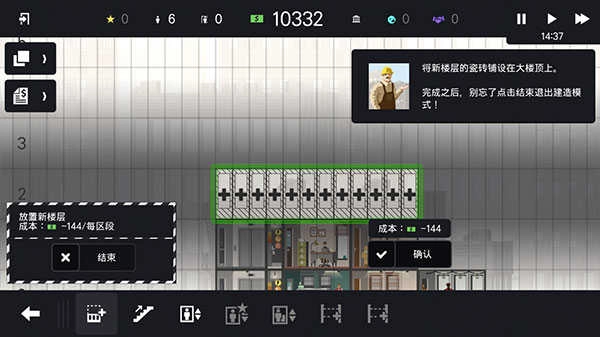 7、按住屏幕向右滑动,选择放置的区域,为摩天大楼新建楼层吧!
