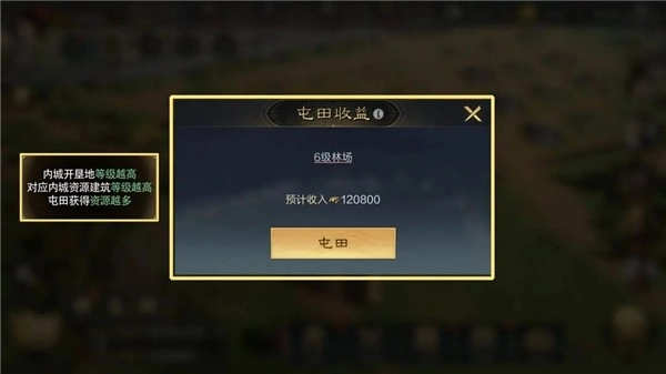 2、根据实际情况选择屯田时机。开垦地与对应内城资源建筑的等级越高,屯田获得的资源越多,但1-5级的开垦地屯田资源差距并不大,主公还是得根据自身实际情况选择屯田时机,好钢用在刀刃上。