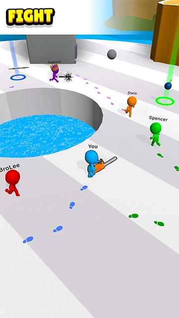 2、操控蓝色小人沿红色箭头指向的路径移动,靠近场景内的武器,开启对战操作流程。