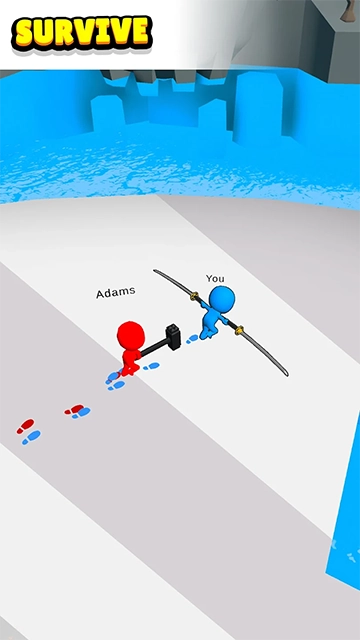 3、操控拾取武器后的蓝色小人,沿红色箭头指向绿色小人方向移动,开展角色间的对战互动,推进游戏进程。