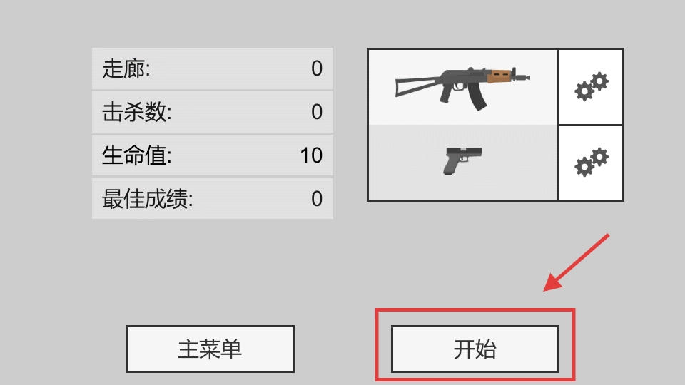 1、点击“开始游戏”按钮,进入游戏准备界面,在这里可以查看武器和相关数据,随后开启僵尸防御挑战。