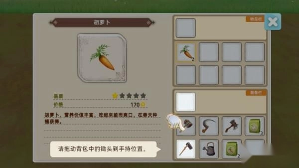 2、将开垦耕地的用具,拖动到手持位置;