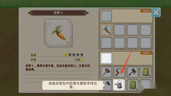2、将浇水用到的农具拖动到手持位置;